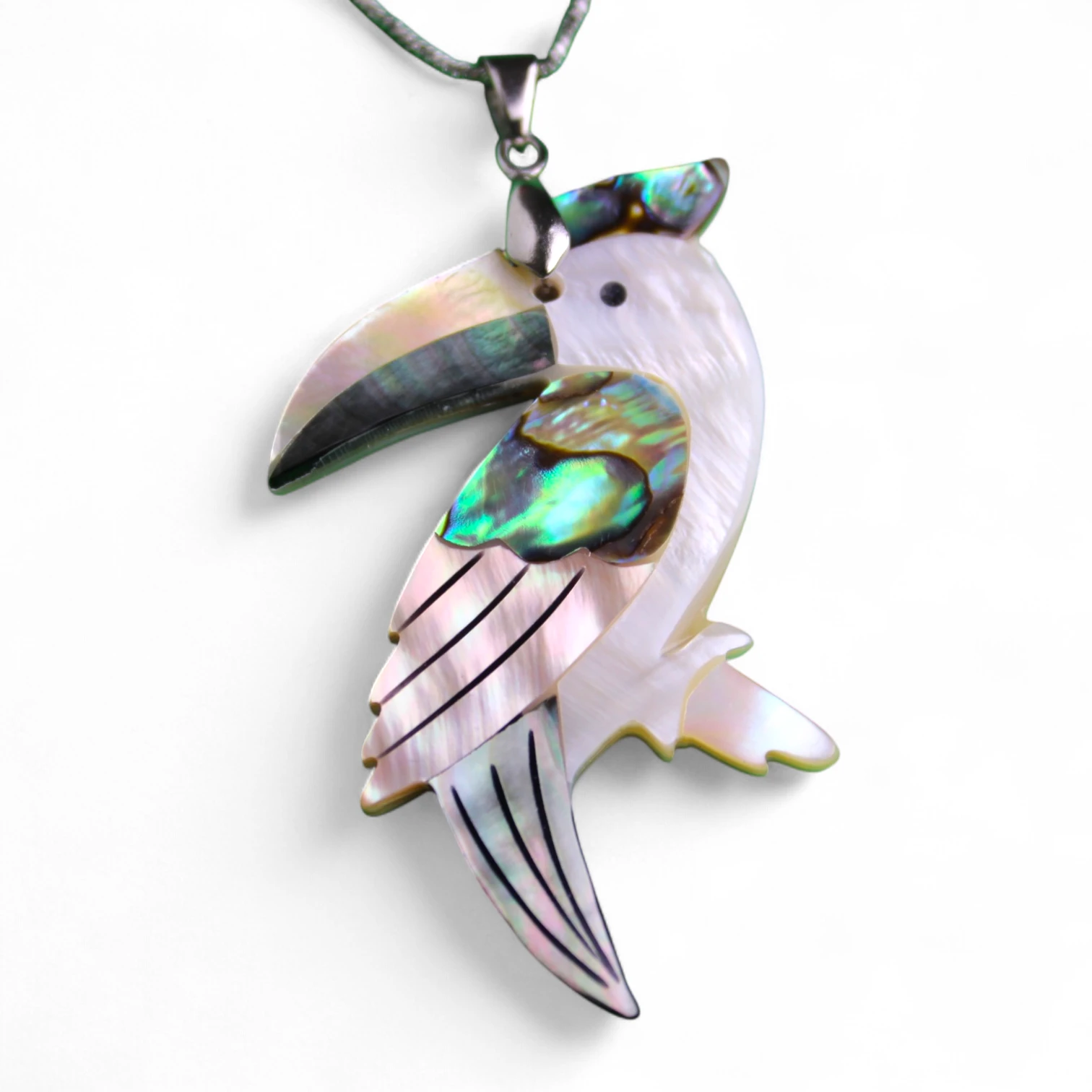 Diseño encantador: Este tucán de nácar auténtico ofrece un brillo natural y tonalidades iridiscentes que capturan la luz de manera única, aportando sofisticación a cualquier atuendo.