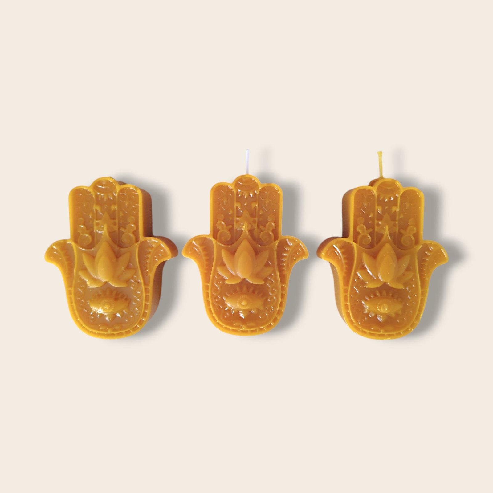 3 velas de cera de abeja natural, 100% virgen y sin aditivos, con forma de Hamsa